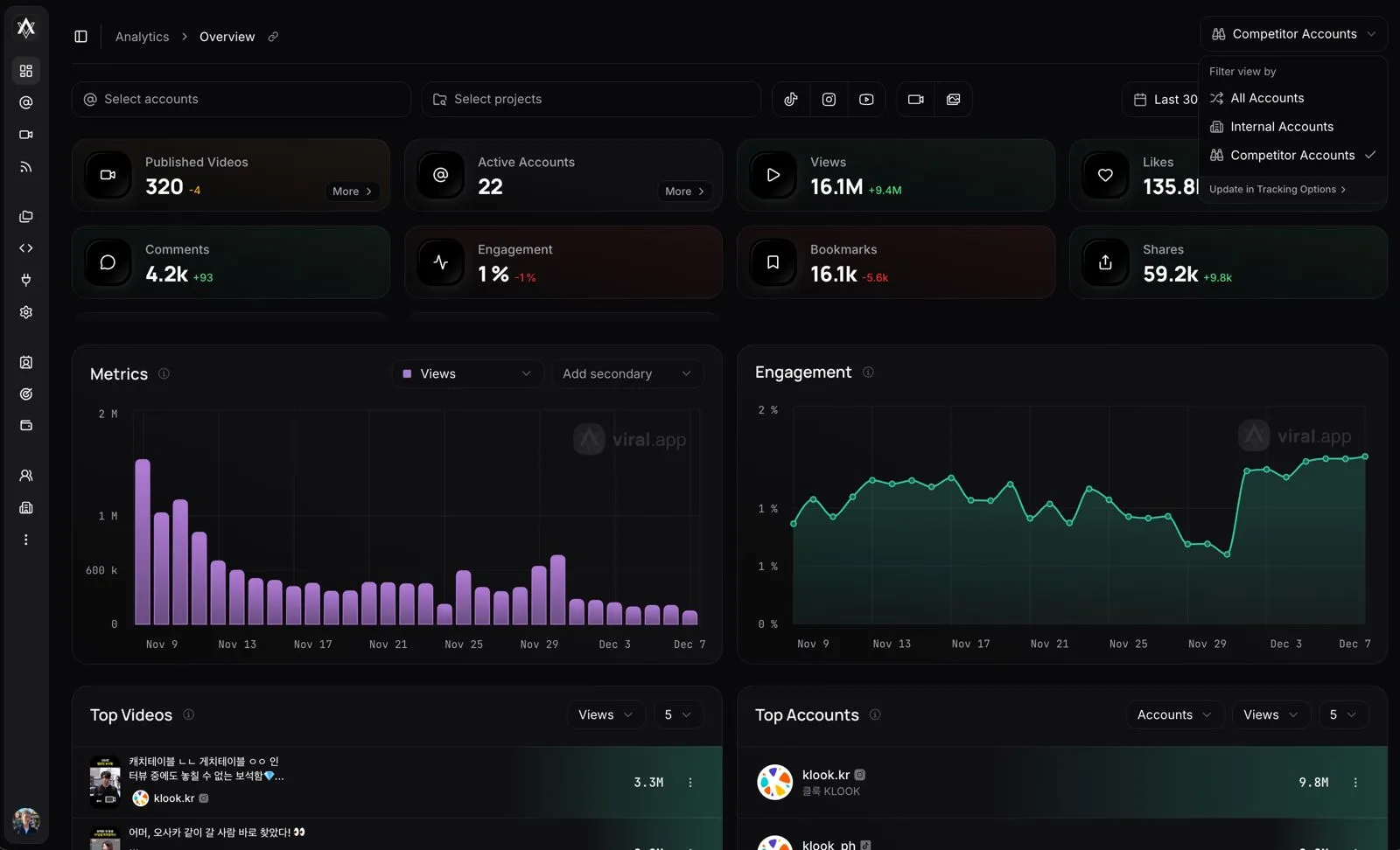 One of the tools I use regularly in my copycat approach is Viral.App. It’s a tracking tool that lets you monitor your own TikTok and Instagram accounts, but you can also use it to track external accounts — for example, your competitors. I use it to follow the accounts of public companies like Cluey and Duolingo, and especially to track my direct competitors.